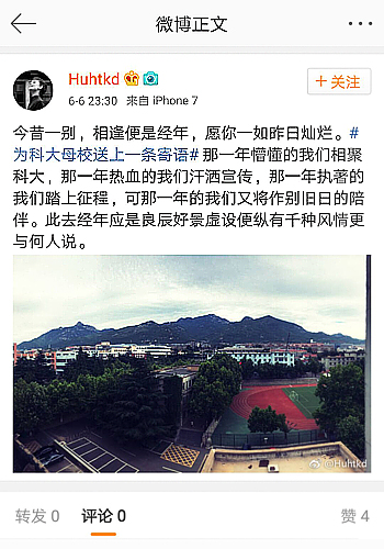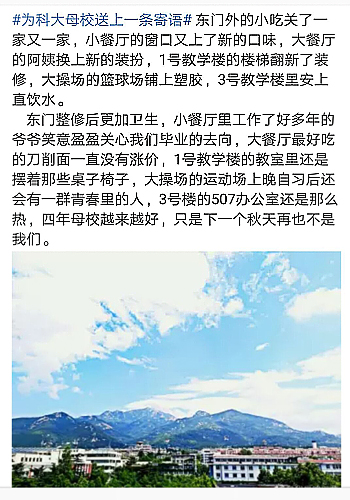 短短几天时间,微博上的留言密密麻麻写满了真挚的文字,其中或回忆自己大学生活的千滋百味,或由自身经历告诫学弟学妹们切莫虚度宝贵的大学光阴,又或抒发对母校的留恋与祝福和对老师的不舍。一位毕业生党员写到:“一路走来,母校已变成我们的第二个家。在这里,我们畅想未来做过许多不切实际的梦,埋头苦干为了自己的梦想不顾一切,品过成功时的踌躇满志失败时的落寞失意。是母校,看着我们一点一滴的成长,给予我们爱的教育。”毕业生党员们在临别之际,留下心中满满的感动,写下最后的毕业赠言,作为对自己、对青春、对母校的纪念。(文/图:刘永康)
