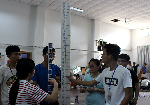 比赛开始,来自不同班级的43支专业组选手将赛前制作好的悬臂塔架结构模型置于实验台上,进行承重测试,部分作品表现优异,在承重6公斤后依然没有明显变形,得到老师和选手们的广泛好评。另外,参赛的82支非专业组代表队的比赛也同时开赛,组委会向每支代表队提供55张扑克牌,选手们需在二十分钟内完成纸牌搭楼的设计制作,模型稳定30秒后由工作人员测量的高度作为评分标准。