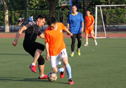 下午,由朱景星、关彤老师带领的资土A队和商岩冬、徐亚鹏老师带领的B队正式展开比赛。赛前,两个球队便分别围在一起进行赛前热身并积极商讨战术。随着比赛哨声的吹响,双方队员迅速进入状态。很快,B队前锋以一个漂亮的正脚背射门为队伍拿下第一分,士气大涨的他们乘胜追击,而资土A队也毫不示弱,逆势调整战术,奋起直追,迅速将比分拉平。之后的比赛中,弧线球、鱼跃扑球和清道夫等足球战术,被双方队员诠释的淋漓尽致,配合默契的他们还上演了一出出插上进攻、密集防守、反越位战术等好戏,为比赛增加了不少亮点。