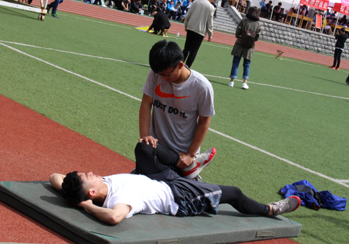 3、高强度的比赛让他的肌肉一直紧绷,热心的同学帮忙按摩。
