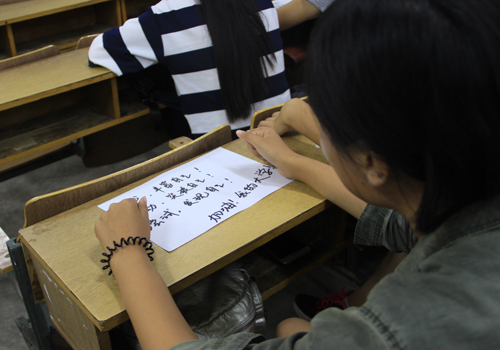 首先,助导让大家在纸上写下自己大学四年来的奋斗目标。15分钟后,同学们手持写好的“奋斗目标”逐个站上讲台,跟大家分享未来四年的计划。有的同学想在大学四年中好好学习,努力考研;有的同学还希望在大学四年跟同学们好好相处,扩大自己的交际圈;还有的同学要在大学谈一场轰轰烈烈的恋爱……同学们的志向各有不同,难得可贵的是他们可以和大家一起分享自己的目标。来自造价16-1的李晓禾同学对记者说:“通过此次主题班会,在将理想与目标跟大家一起分享的同时,也是对自己的一种激励!”