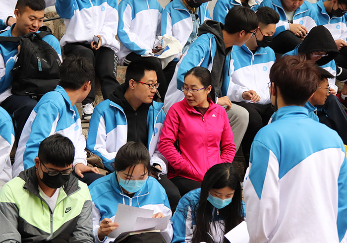 辅导员坐在班级观众席中,询问班级同学近况,现场解答同学们学习生活中遇到的问题,提醒班长注意运动会期间的班级情况,做好应对突发状况的准备,提醒运动员保证自身安全,做好赛前热身,并在运动员比赛中与同学们一起为他们加油助威。(文/图: 崔译丹)