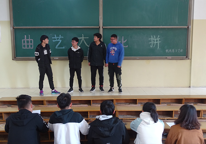 据悉,欢声飞扬队、名称待定队、莫得感情队、无名之辈队、地表最强小战队五支队伍将代表机电系参加校区曲艺大比拼的比赛。(文/图:李峰)