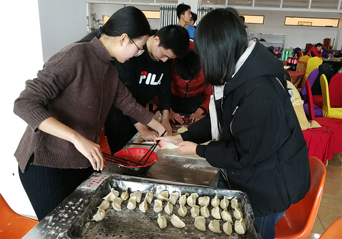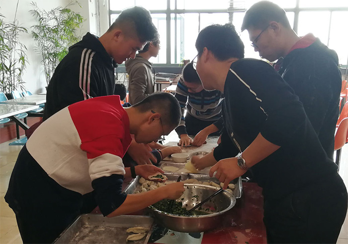 本次活动分为“包水饺”和“幸运彩蛋”两个环节。第一环节,班级同学分为三组,利用餐厅提供的食材,各组组员之间分工合作进行包水饺挑战赛;第二环节,由吃到“糖果水饺”的同学演唱歌曲,吃到“蒜瓣水饺”的同学选择“真心话”或“大冒险”游戏。班长邵长凯说:“本次活动是为了增进同学间的感情,让同学们在合作中感悟团结的真谛,提高班级凝聚力。”(文/图:陈明龙 张笑旗)