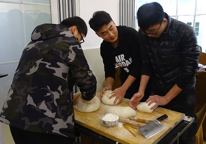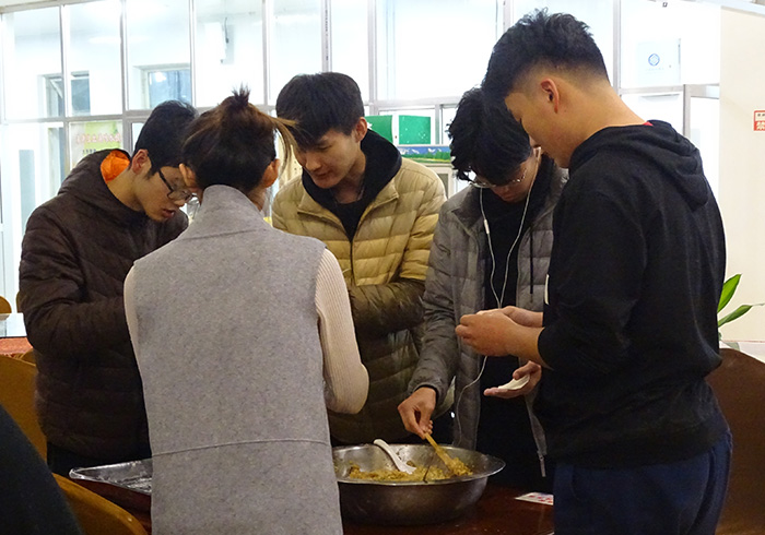 干事们分好组,利用餐厅提供的材料,分工合作进行揉面、擀皮、拌馅、包水饺。大学生科联主任曹堰安说:“冬至就要到了,组织大家在一起包水饺,希望大家能在学校体会到家的感觉。”(文/图: 赵乐康)