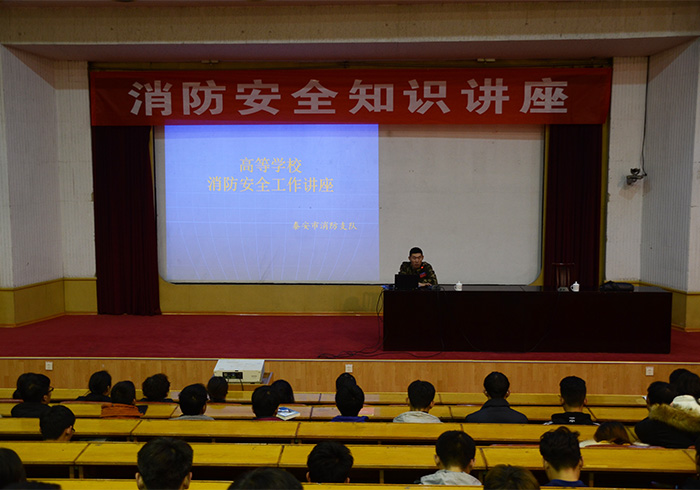 11月29日下午,消防安全知识讲座在4号楼报告厅举行,泰安消防支队防火处参谋李昊主讲,机电系2018级宿舍长、分管学生宿舍工作老师、宏泰物业有关人员参加。