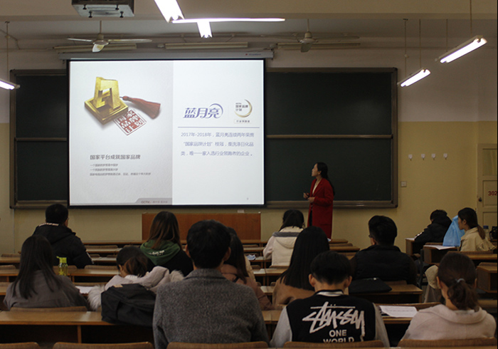 宣讲人员首先以视频的形式介绍了蓝月亮洗衣液的功能以及蓝月亮企业的人才培养、薪酬、合作氛围,接着以一首诗介绍了公司的理念、背景等,并结合PPT从五方面说明公司组成、工厂概况、品牌地位、企业文化、产品与服务。宣讲人员说:“蓝月亮的价值观是卓越、诚信、尊重,宗旨是一心一意做洗涤,我们企业会一直走在提升洗涤能力的路上。”最后,蓝月亮企业代表人员与机电学子进行了交流,并对他们提出的问题进行了详细的解答。