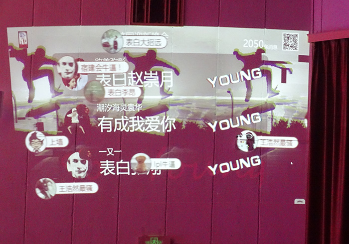 同学们通过扫描二维码关注机电系微信公众号,并在微信公众号上对迎新晚会的看法进行留言。活动负责人孙传斌将同学们的留言制作成弹幕,并将其投影在礼堂侧墙上进行实时滚动播放。