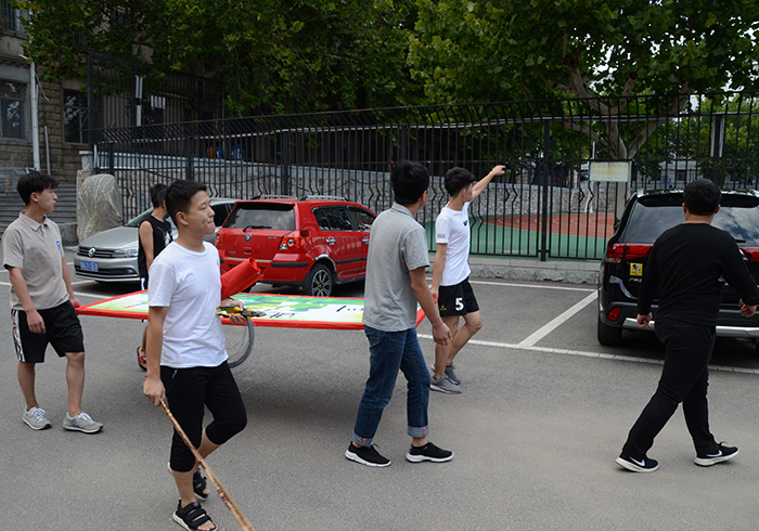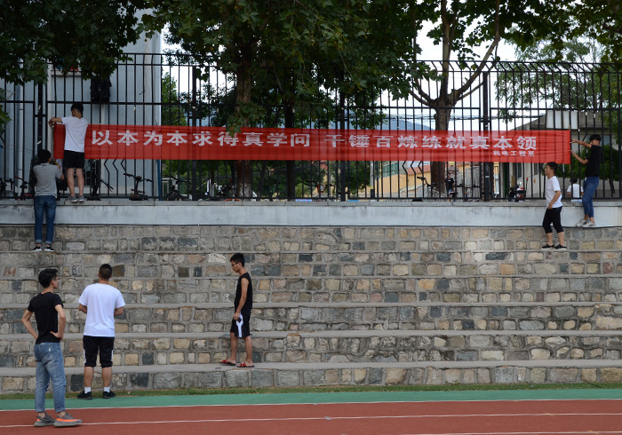 9月9日下午,机电系学生会开始进行新生军训宣传展板和横幅的搬运、安装、整理、摆放工作。负责人刘弘兴带领机电系宣传部、校园部和社团部共13名人员将制作好的宣传展板放置校操场门口,将横幅固定在操场北面栏杆上。
