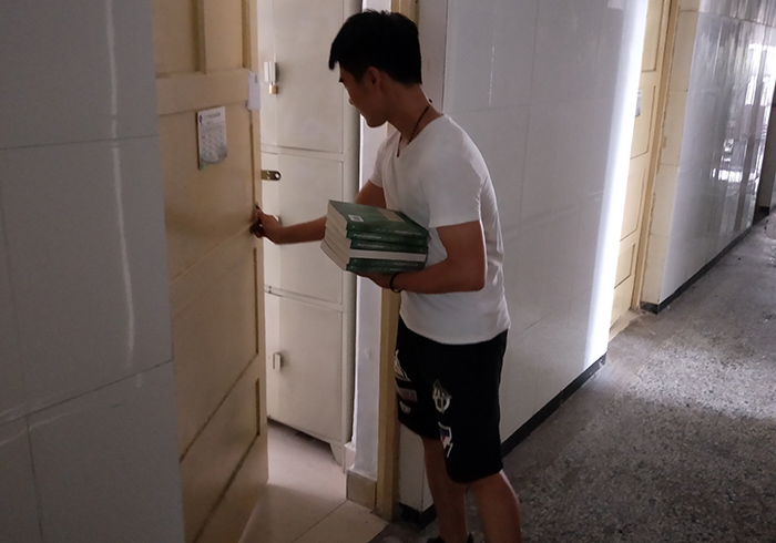 班长分发新学期课本。