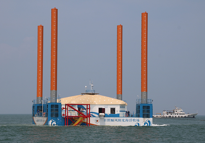 团队成员在“站桩”现场看到,工人师傅正控制4根37米高的钢柱慢慢深入17米深的海中,并将钢柱插入海底4米深。日照顺风阳光海洋牧场董事长苏照元向团队成员介绍,“阳光1号”是日照市首座国家级海洋牧场大型游钓平台,共投资1600余万元,历时8个月建造,总面积约为1.5个标准篮球场大小。