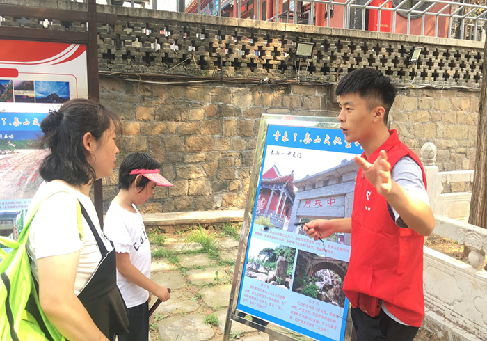 实践团队成员在查阅有关景点的历史故事、人文特点等资料之后,秉持“以文化提升旅游,以旅游传播文化”的理念,对泰山的几大景点进行了宣讲,并对游客咨询的问题进行充分细致的讲解,得到了游客们的认可。