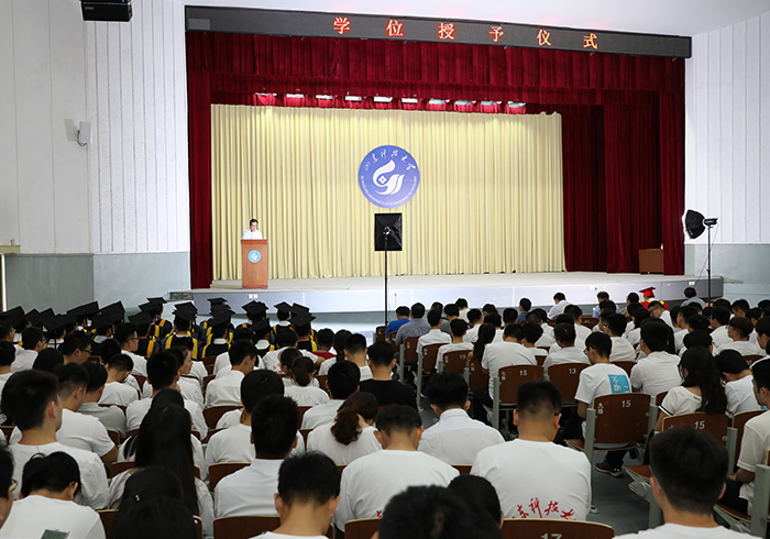 6月26日下午,机电系在东校园礼堂举行2018届本科毕业生学位授予仪式。泰安校区、泰山科技学院党委常务副书记刘传玺应邀出席仪式并为478名获得学士学位的本科毕业生拨穗正冠,颁发学位证书。教务部副主任卢军、系党总支书记张建中、系主任刘然慧、其他系领导及各部门负责人、辅导员及系全体本科毕业生参加仪式,系党总支副书记殷永贵主持仪式。