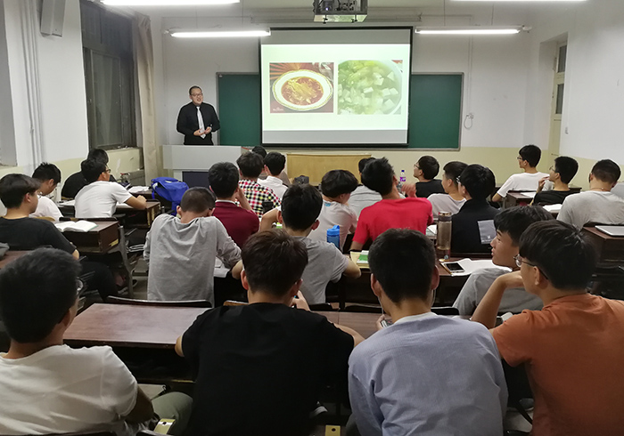 李晓宇介绍了“中国菜”从远古时代的茹毛饮血到现代成为世界三大菜系之一的发展历程,他以大量的图片向同学们分享“中国菜”的代表之一“鲁菜”。他说,“鲁菜”最大的特点是调味纯正,口味偏于咸鲜,并具有鲜、嫩、香、脆的特色。最后,李晓宇和同学们一起观看了美食纪录片“舌尖上的中国”片段。