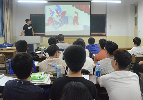 乔迁为同学们普及篮球的发展和推广,结合NBA视频描述篮球的基本规则和各队员所在位置的对应任务。乔迁将篮球运动总结为四个字和六个特点,即:快、高、全、准和集体性、对抗性、技巧性、趣味性、娱乐性、健康性。