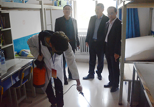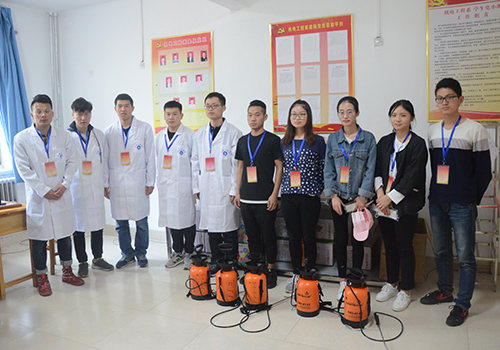 下午5点,党员们穿好工作服、戴上专用口罩和手套,肩背喷雾器,对机电系全体学生宿舍进行了预防消毒作业。