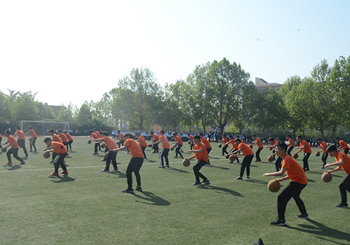 鼓声擂起后,由48人组成的篮球操方队跑进操场草坪中央。随着音乐的响起,身着统一服装的篮球操队员们体前运球、胯下运球、单手转球等动作整齐划一,赢得观众们阵阵掌声。随后,双截棍6人组身着统一道服跑进操场中央,将短小精悍的双截棍耍的刚劲有力、潇洒自如。