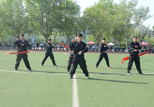 4月19日,机电系表演方队在校区运动会开幕式上进行了篮球操与双截棍汇报表演。