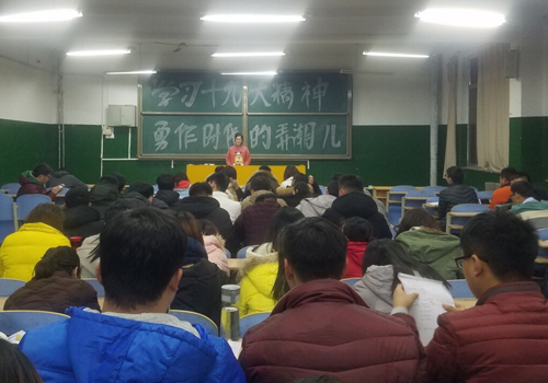 张婷和田飞带领同学们学习了党的十九大精神和会议相关材料,并传达了十九大报告会上习近平总书记专门就当代青年承担使命、接续奋斗提出的期许。随后,两人结合自身工作,与同学们讨论了“对十九大精神的理解”、“如何争做时代的弄潮儿”等问题。期间,同学们踊跃发言,分享了自己对十九大精神的理解及如何在自己的学习和生活中践行十九大精神,并就“勇做时代的弄潮儿”这一主题进行了阐述,表示要认真学习与贯彻“身为当代大学生要坚定理想信念,脚踏实地,在实现中国梦的生动实践中放飞青春梦想,在为人民利益的不懈奋斗中书写人生华章!”这一新精神要求。(文:江丰 申建正 图:田飞 )