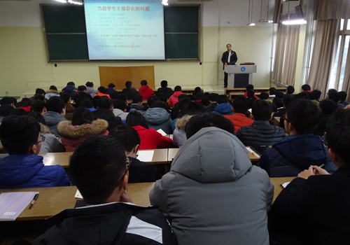 12月27日,机电系团总支书记谢清勇在5#406为全体学生会干部作“挖掘潜力、提升素质,打造一支高效的学生干部队伍”的专题培训。