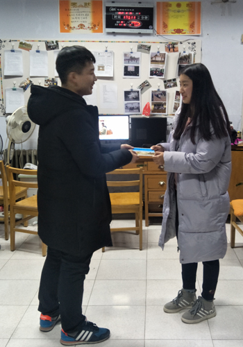 12月24日,平安夜来临之际,机电系学生会干事给系学生会主席、部长赠送贺卡。