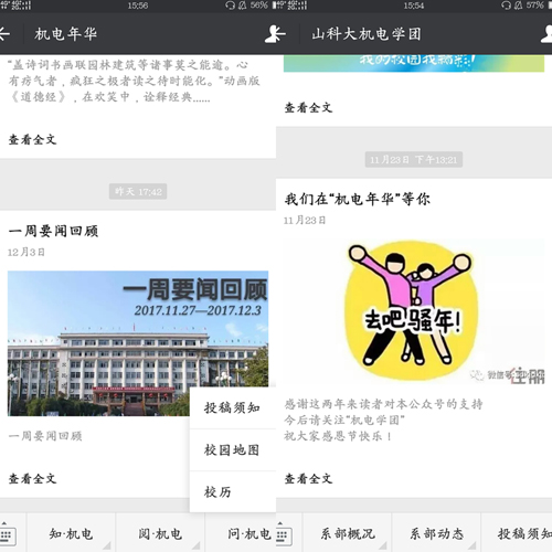 11月18日,机电系新闻中心网络编辑部成员利用一天时间,对新公众号进行修整和包装。在对新公众号的菜单栏进行整理时,在原“山科大机电学团”的菜单栏“系部概况”、“系部动态”、“投稿须知”之上,新增加了“校园地图”、“校历”等新的小菜单,且更详细地将发布的内容分成了“系部动态”、“部门活动”、“夜读精选”等专栏,更利于读者们选择性地浏览。