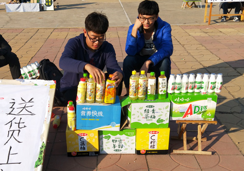 11月12日,机电系“金拱门”营销队伍走进山东科技大学西校进行娃哈哈产品推销。