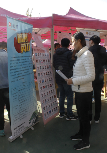 在招聘会上查看各公司宣传海报上的信息。