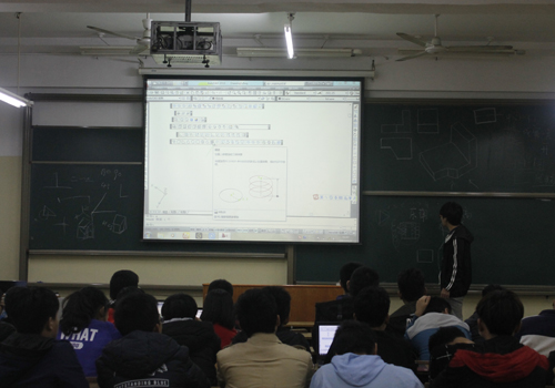 科技联合会主任陈海利利用多媒体向干事们演示了CAD软件的绘图过程,在黑板上画出二维及三维图形,并讲述了两者之间的差别。其中一名干事自带电脑,在培训过程中边学习边练习。在会后接受采访时他说:“经过这次培训,以前不懂的现在都弄明白了,使用CAD软件绘图时操作更加流畅了。”(文:杨俊哲 申建正 图:杨俊哲)