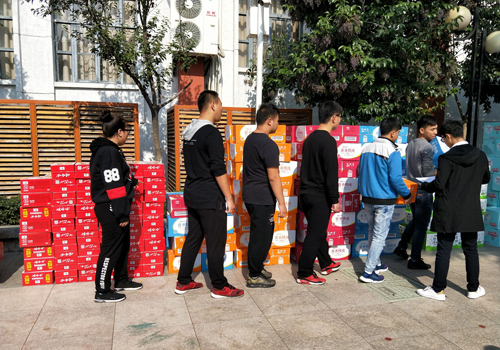 10月28日,机电系32支营销队伍在文化广场接收第一批娃哈哈营销大赛营销产品。