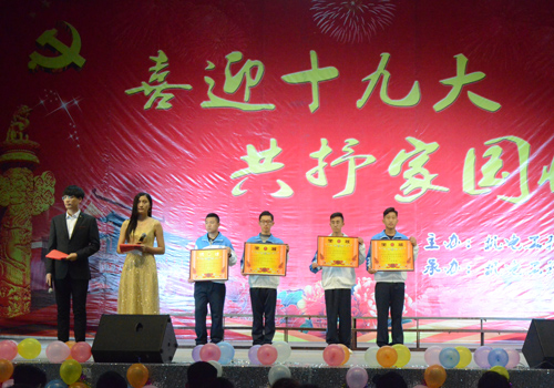 舞台上,各班级合唱队依次上台演唱歌曲,宏伟磅礴的《歌唱祖国》,激昂慷慨的《精忠报国》,充满蓬勃朝气的《追梦赤子心》等歌曲,通过穿插朗诵、动作表演等方式,向机电系师生展示了默契的配合和昂扬向上的精神。高永斌等退伍军人的一首《我们就要上战场》,唱出了为祖国奉献的热情,赢得台下师生阵阵掌声。经过评选,机制(本科)17-3及机械电子(高本)17-1两个班级获一等奖。韩子玉、殷永贵、侯静娴等为获奖班级颁奖并与获奖班级、工作人员合影留念。(文:曹政昊 图:亓浩东)
