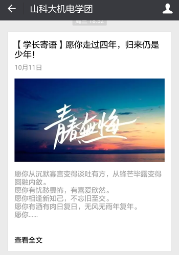 活动面向14、15、16级学生,形式、字数不限,学生将作品以邮件的形式发送到邮箱。截至10月1日,新闻中心共收到26篇学长寄语,分别来自新生助理辅导员、学生会部长、协会会长等不同角色的“学长”,其内容以对新生的关切、希望及美好祝愿为主。其中,系学生会副主席邢开对新生寄语道:“愿你从沉默寡言变得谈吐有方,从锋芒毕露变得圆融内敛。没时间世俗的矫揉造作,不作无意义的嬉笑怒骂,你可以临风浪不动声色,但锐气只留给星辰大海。”自动化16-1班刘艳萍寄语新生:“人生有苦有乐,有哭有笑,而大学是人生的一个阶段,自然少不了五味杂陈。愿你遇事沉着冷静,不要轻言放弃。记住,你是在用青春“赌”大学,所以必须要赢。”“希望通过这个活动,能将老生一些大学生活学习的经验感受传给新生,并借此拉近老生与新生间的距离。”系新闻中心郑璐说。日前,新闻中心已选择其中优秀的寄语在“山科大机电学团”微信平台进行展出。(文: 申建正 图:郑璐)