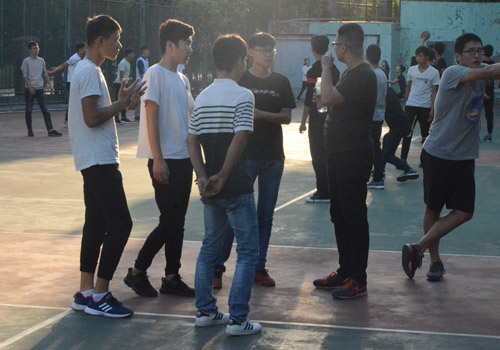 新生虚心听取学长的指导,下半节比赛一定要打出气势。