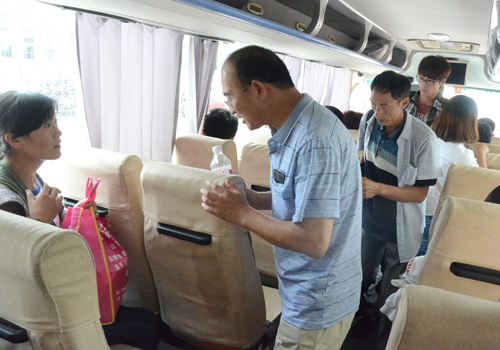 迎新人员在火车站出口处举起学校的指引牌,迎接新生和家长到接待处稍事休息后,带领新生和家长到校车停放处。迎新队伍由4名教师和12名学生组成。系火车站迎新学生负责人李国昌在出发前提醒迎新同学要人身和财产安全,并与同学们分享了去年迎新时总结的经验。