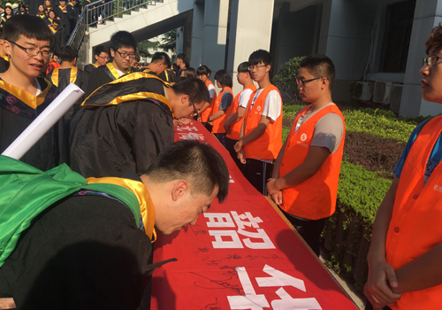 6月9日,机电系在一号楼前组织进行毕业生“青春无悔不毕业,韶华有诗且远方”横幅签名活动。