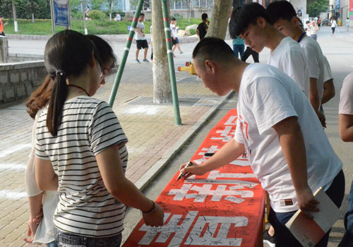 机电系权益部成员在小篮球场东侧挂起了“丢掉一支烟,清新满校园”的横幅,并向路过的同学介绍吸烟的危害,呼吁同学们在横幅上签名。