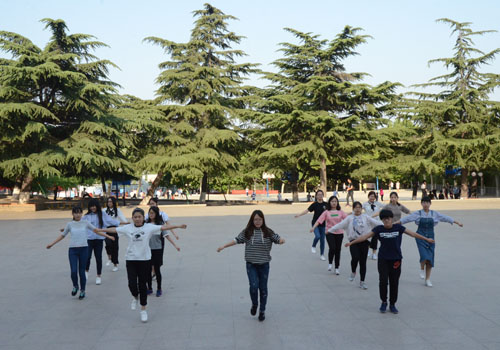 5月9日下午,机电系啦啦操队在文化广场进行彩排。