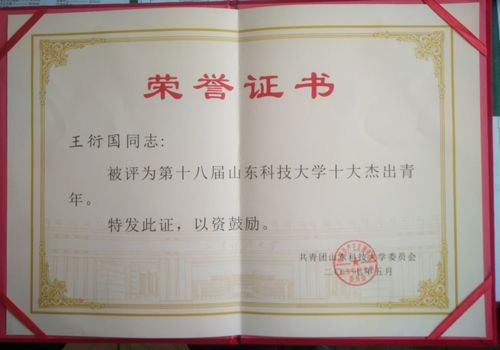 据悉,王衍国老师曾指导学生参加“山东省大学生科技创新大赛”等比赛取得省级以上奖励20余人次。曾获第七届“山东省优秀辅导员”和“泰安市优秀团干部”等荣誉称号;先后获山东省、泰安市和学校暑期“三下乡”优秀指导教师。曾获山东省高校辅导员职业能力大赛三等奖、学校“我心目的好老师”、“优秀辅导员”、“优秀园丁”、“学生管理优秀奖”、“优秀工会积极分子”等称号。(文/图:李银涛)