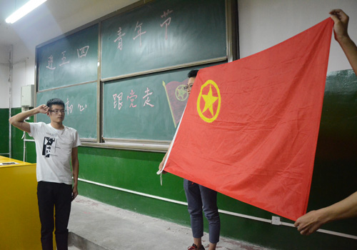 班会上,王保垒与同学们分享了五四青年节的由来,并要求同学们多了解中国的近代史,牢记历史,勿忘国耻。他向同学们讲解了机电系“三个出来”党员旗帜工程,并希望班内的团员以此为契机,在党的十九大即将召开之际积极响应号召,加强理论学习,培养专业素养,在实践中坚定自己的理想信念,不忘初心跟党走,培养自己的爱国情操。最后,王保垒组织同学们重温了入团誓词。(文: 申建正 图:葛丽媛)