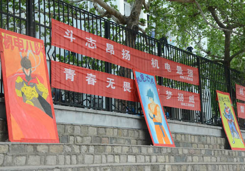 在绘制工作开始前,宣传部对展板所用颜色、图案以及文字的选用问题进行反复讨论,最终选定采用动漫人物的形象做展板图案。宣传部全体成员及各班宣传委员都投入到了展板的绘制工作中。经过一周的时间,宣传部展板制作完成,并在机电系运动会各方队观众席上展出。(文:申建正 图:李银涛)