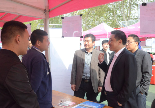 系领导来到招聘摊位前,与用人单位进行交流。