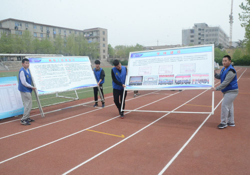 和人一般高的展板在招聘会开始的两个小时前被学生们运到了大操场,他们用劳动的身影来迎接晨间的阳光,他们是最棒的!