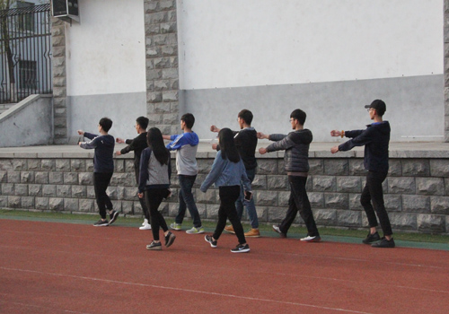 4月5日下午,机电系男礼仪在体育场进行培训,为运动会颁奖仪式、举方队引导牌做准备。