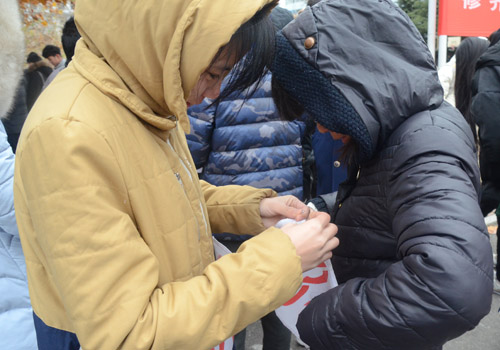 队员们互相帮助佩戴号码布,带来冬日里的温暖。
