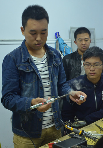 培训会上,电子爱好者协会会长崔永振介绍了电烙铁、锡铁条、热风枪等电工制作和电器维修的常用工具。他讲解了自己的毕业设计“温度控板”的制作原理,并以温度控板和豆浆机为例向成员们展示了电工电子在生产生活中的广泛应用。最后,崔永振现场演示了各种工具的使用方法。(文:郑璐 周雪 图:郑璐)