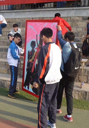 4月14日早上六点半整,学生会工作人员来到观众席把桌子、展板摆放整齐等待运动会的开始。