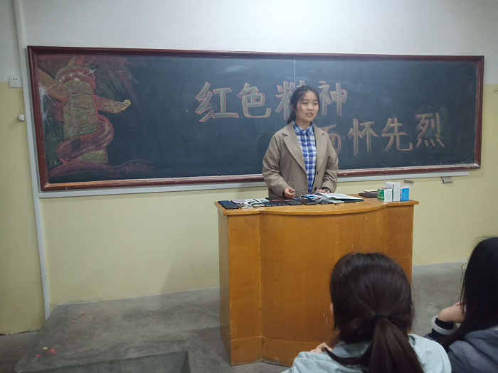 会上,刘雪妮通过宣讲革命烈士为党和人民的事业奉献终身的事迹,带领大家重温革命岁月,学习革命先烈的爱国主义情怀。随后,刘雪妮向同学们讲解红色精神的内涵,并通过提问的方式,让同学们更加深入的了解红色精神。最后,刘雪妮向同学们播放红歌,嘹亮的歌声在耳边回荡,那份激动、庄严和澎湃,是对同学们灵魂的洗礼。通过此次班会,相信同学们能学习到革命先烈的优秀精神品质,在未来的道路上深刻落实党的十九大精神,为祖国的发展建设贡献力量。(文:赵丽丽 图:郭妙欣)