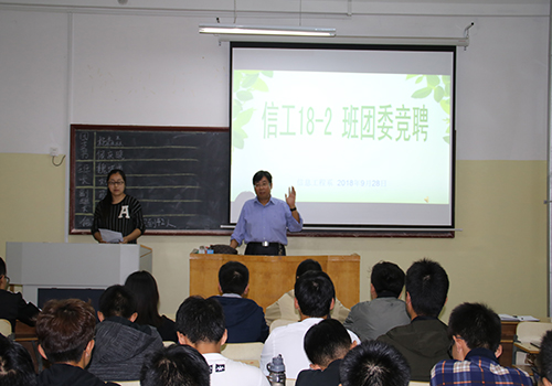 9月28日,信息系组织开展新生各班级班委、团支委学生干部竞聘会---团支书、班长、副班长竞聘主题班会。信息系党总支副书记裴国栋、新生辅导员卢业美、各班级学生兼职辅导员参与,会议由裴国栋主持。