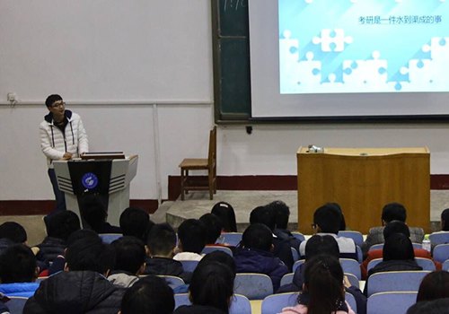会议开始蒲蓬勃就学校历年的考研率与同学们做了分析,引出考研的重要性。紧接着由郝孝帅分享考研保研经验。“为什么考研”一直是一个困扰同学的问题,郝孝帅总结两个主要原因,一是提高自己的学习能力,二是提升自己的价值。随后,郝孝帅从两部分讲述保研考研之路。第一部分为如何获取保研名额,校内的保研名额以成绩为重占到90%,科研为10%就科研成绩而言郝孝帅表示参加的比赛类别应为政府主办,全国性的国家级,省级比赛,如“挑战杯”,“蓝桥杯”,数学建模等,其次是校外的保研补偿名额,途径为夏令营,学长用诙谐幽默的语言为大家分享了他参加夏令营的经历和遭遇,希望大家能做好充分的准备,积极参加。又为同学们提供了几所拥有保研补偿名额的学院,中国科技大学,国防科技大学,华中师范大学等。第二部分为如何选择院校,郝孝帅学长分享了两个了解的平台,保研论坛和保研通APP,更为大家展示了如何使用。接着是如何选择专业,以兴趣为重,选择正确的导师,专业前景好。又为大家提了几点保研的小建议,获取保研资格学习绩点至少在3.8以上,他呼吁同学们要以学习为主,其次,要重视学习英语,加强英语口语,积极参加科技竞赛。最后郝孝帅以三句话勉励同学们努力学习,一、“机会总是给有准备的人”二、“脚踏实地去做你想做的每一件事”三、“在能奋斗的年纪没有理由选择安逸”。