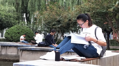 还有的同学捧上一本喜爱的书本,听着抒情的音乐感受大学的美好。